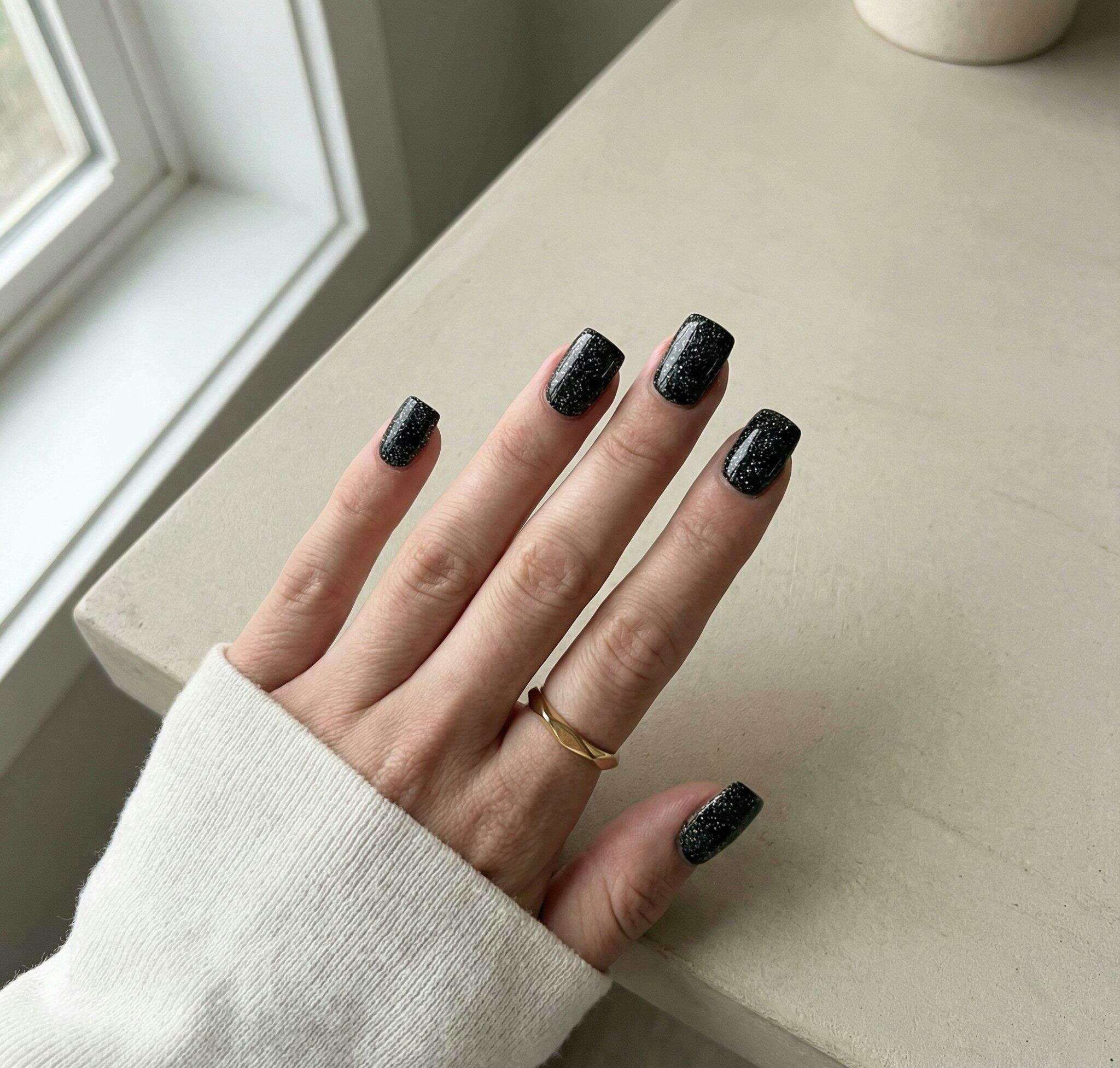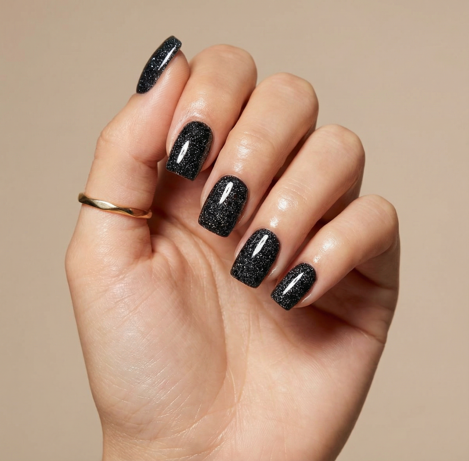 The deep black base paired with subtle sparkle creates a sleek, edgy finish that instantly elevates any outfit.