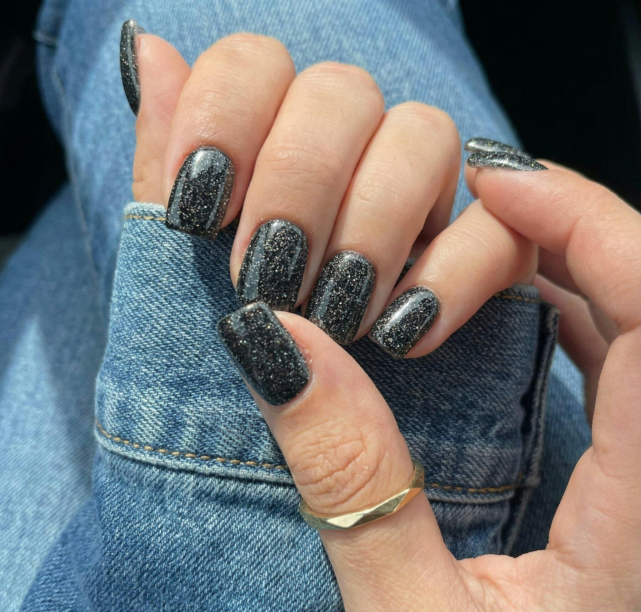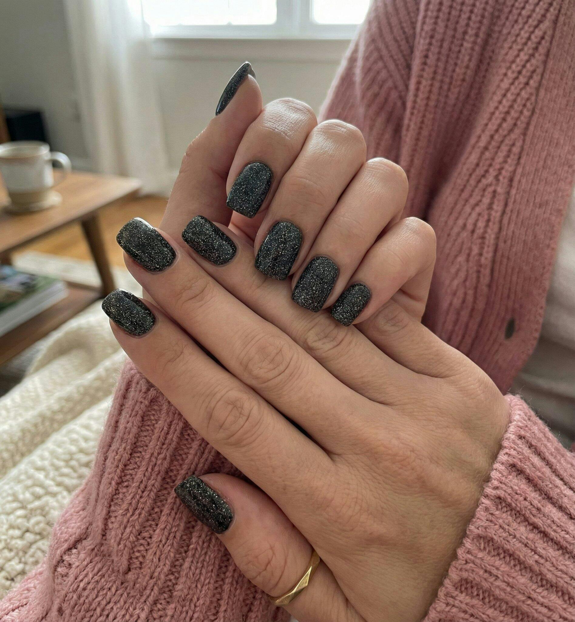The dark shade with the fine sparkle feels modern and easy to wear, perfect for everyday outfits.