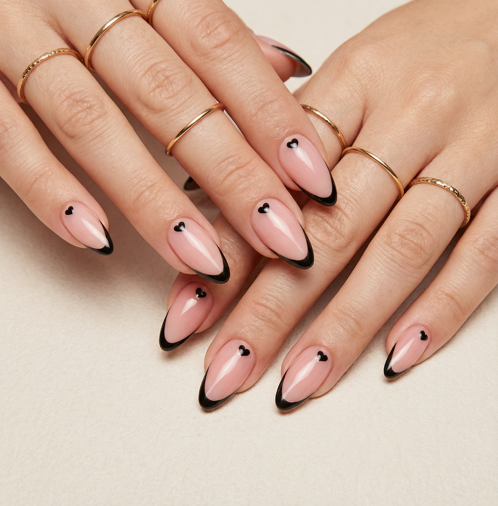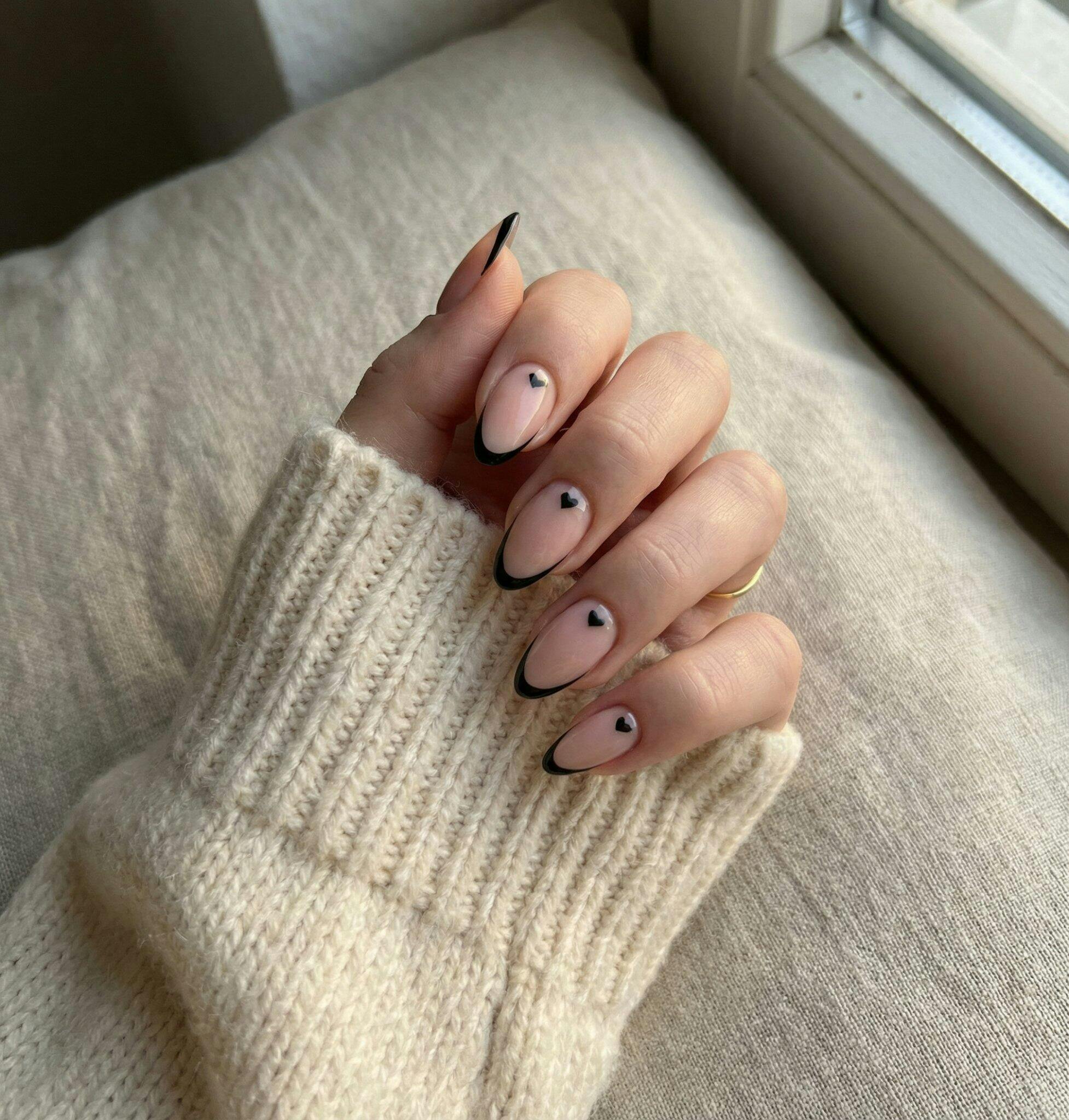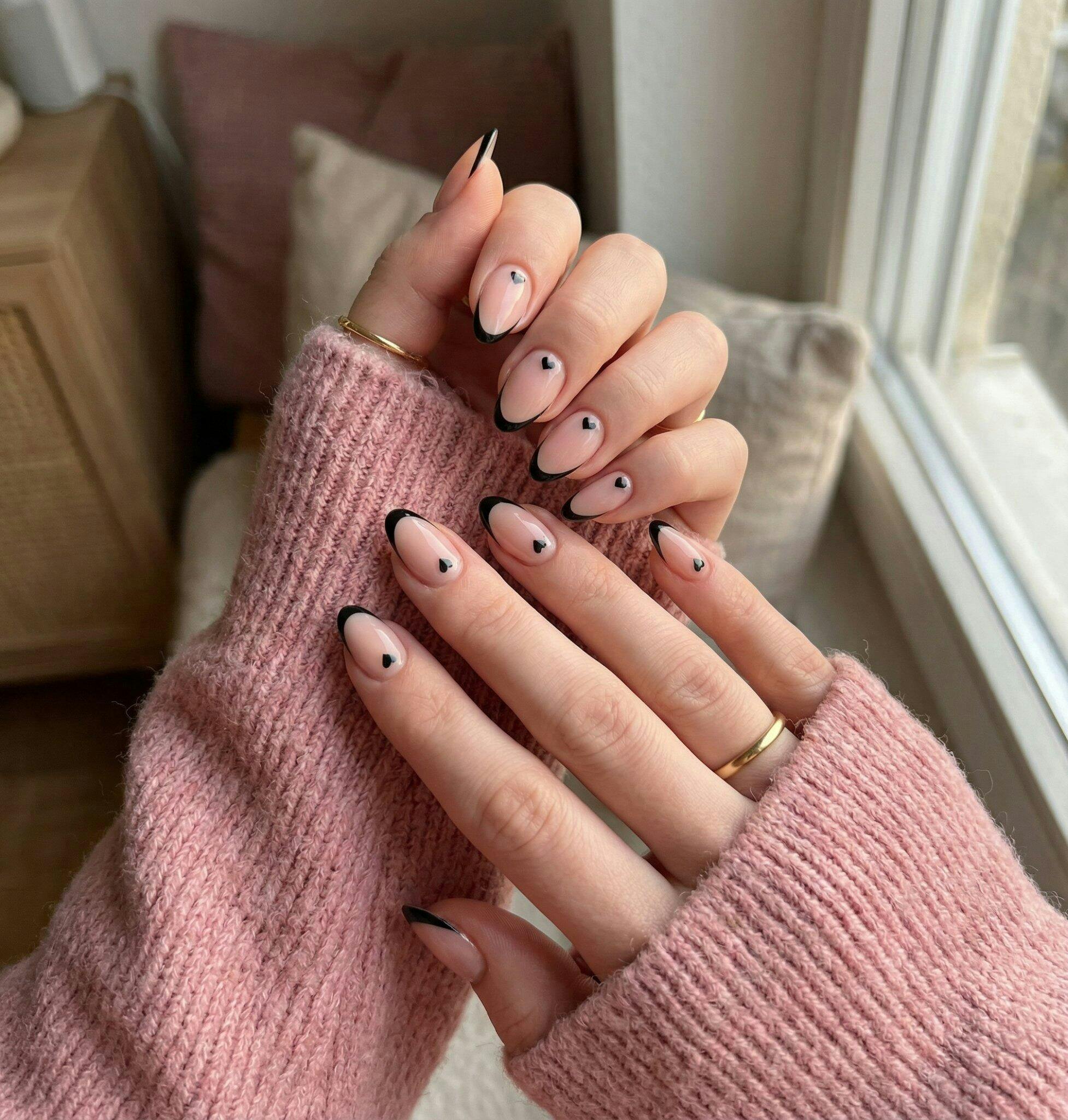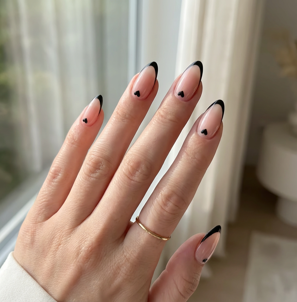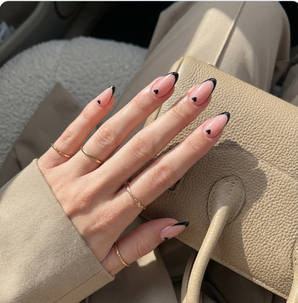 The soft nude base paired with delicate black French tips and tiny heart details creates a look that’s elegant, modern, and irresistibly feminine.