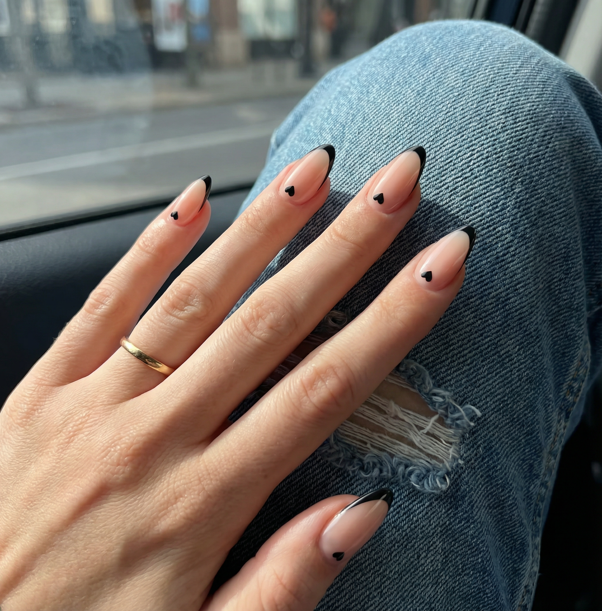 These nails feel incredibly cozy and elegant at the same time. I was relaxing on the couch in a soft sweater, and they looked beautiful in the warm natural light. The nude base is so flattering, and the thin black tips with the tiny heart details add just the right amount of character without being too bold. They’re lightweight, comfortable, and perfect for everyday wear when you want something simple but refined.