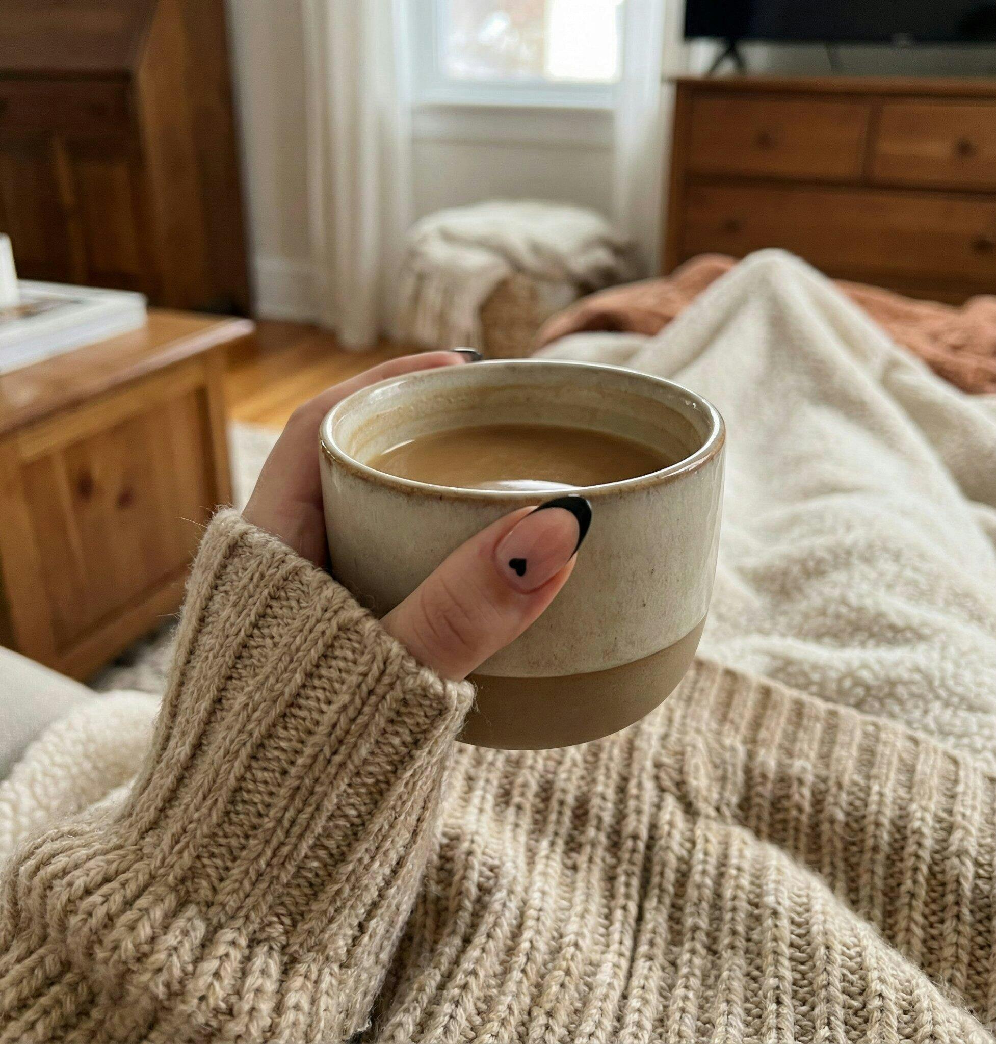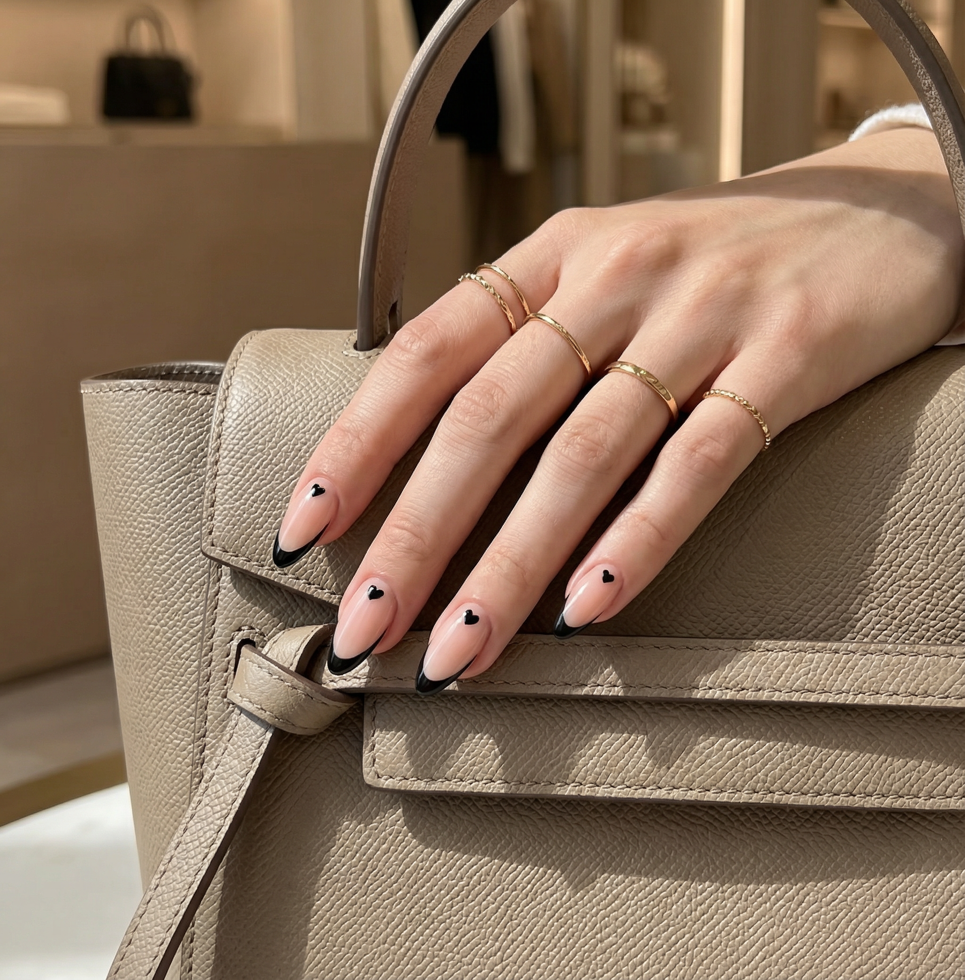 These nails are perfect for slow, cozy mornings. I was sitting in bed with a warm coffee, wrapped in a sweater, and they looked so soft and elegant. The nude base with the black tip and tiny heart detail feels minimal but very stylish. They’re lightweight, comfortable, and don’t get in the way at all — even while holding a mug. Such a beautiful everyday set that fits perfectly into calm, cozy moments.