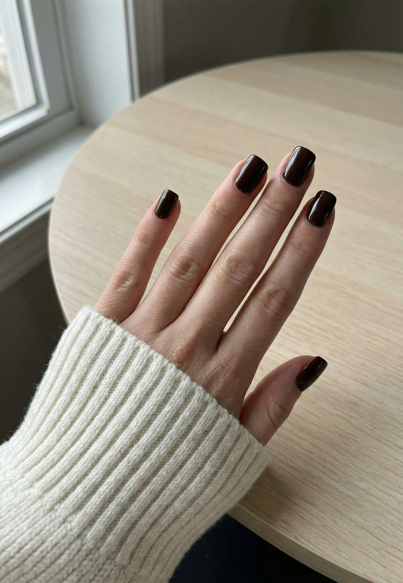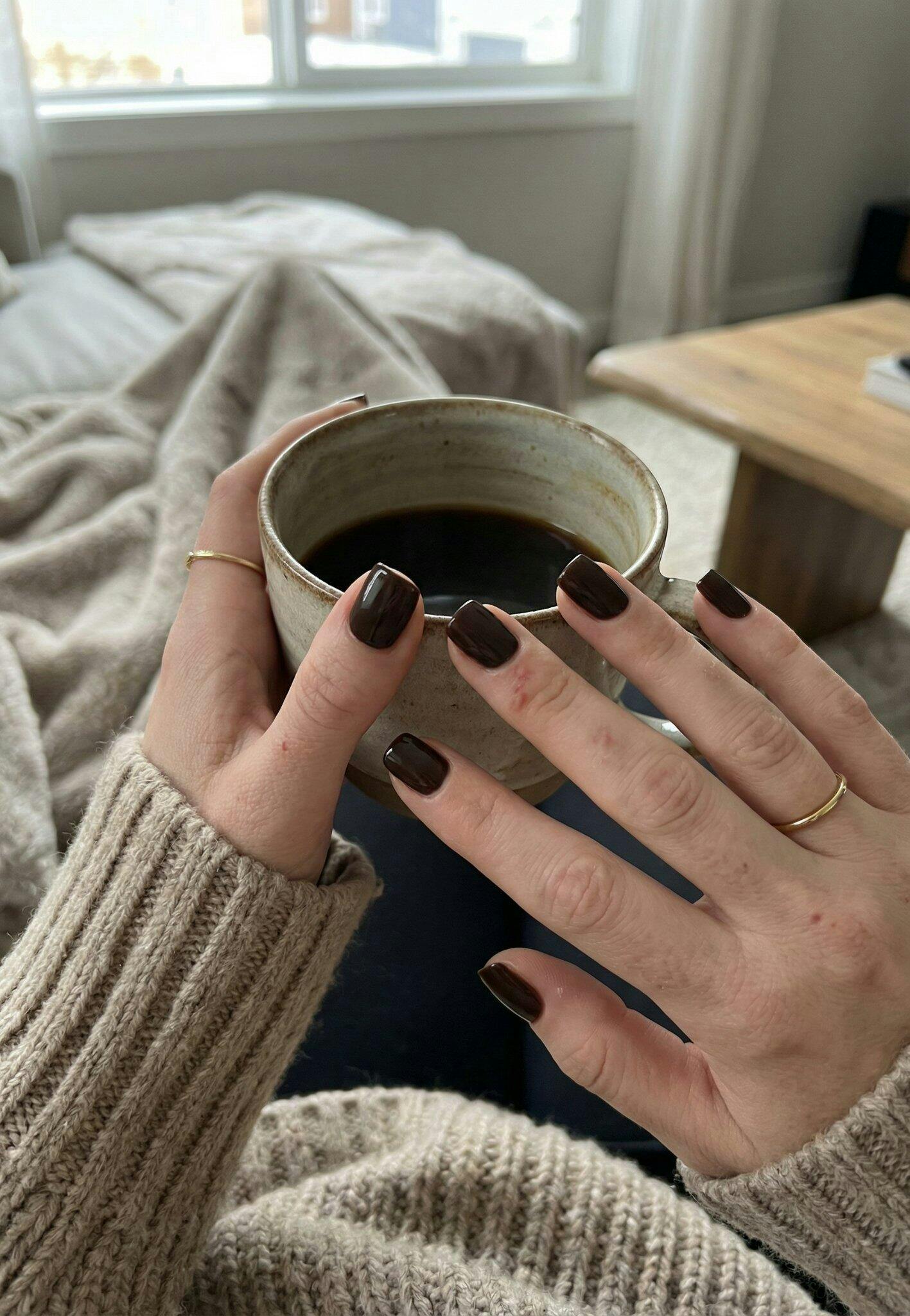These nails are absolutely perfect for calm, cozy mornings. I was sitting comfortably at home with a cup of coffee, and they looked so elegant and rich in the soft daylight. The deep brown shade feels warm and classy, and the glossy finish makes them look very polished without being too bold. They’re comfortable to wear and don’t get in the way at all, even while holding a mug. Such a beautiful everyday set that feels relaxed and refined at the same time.